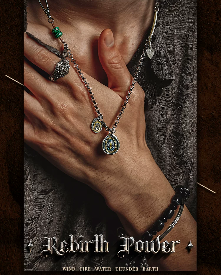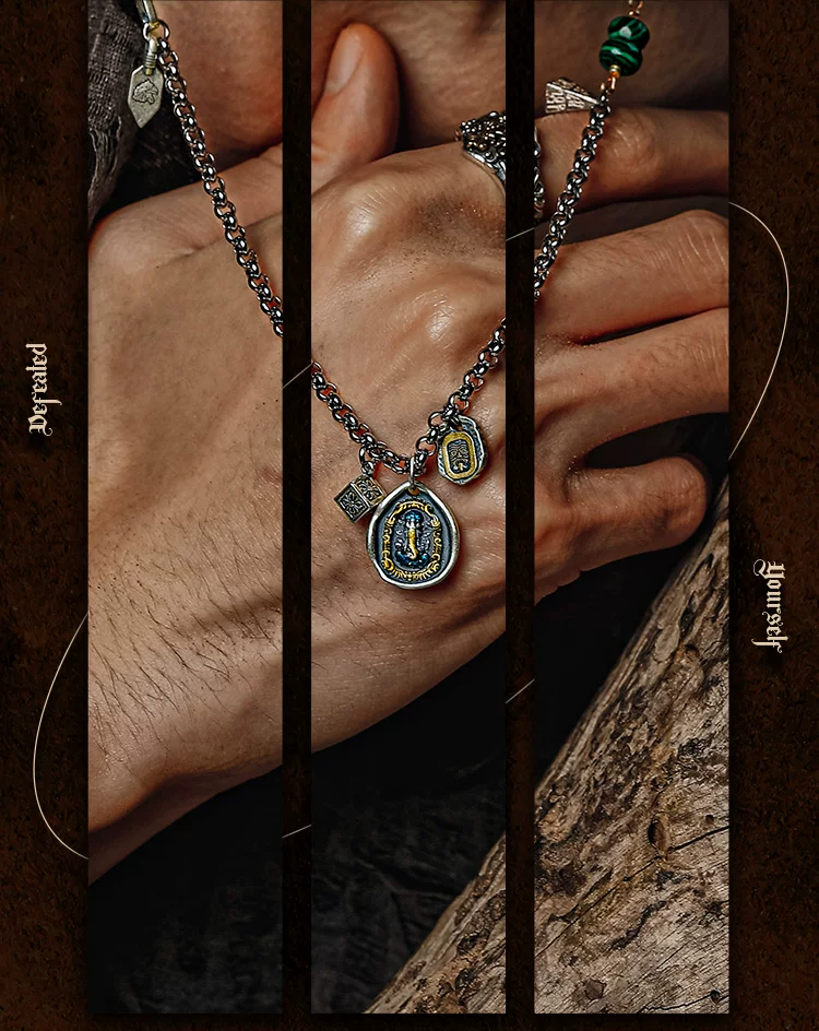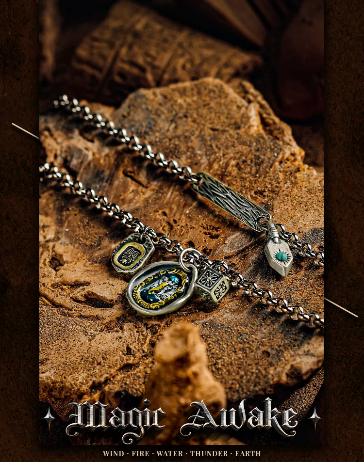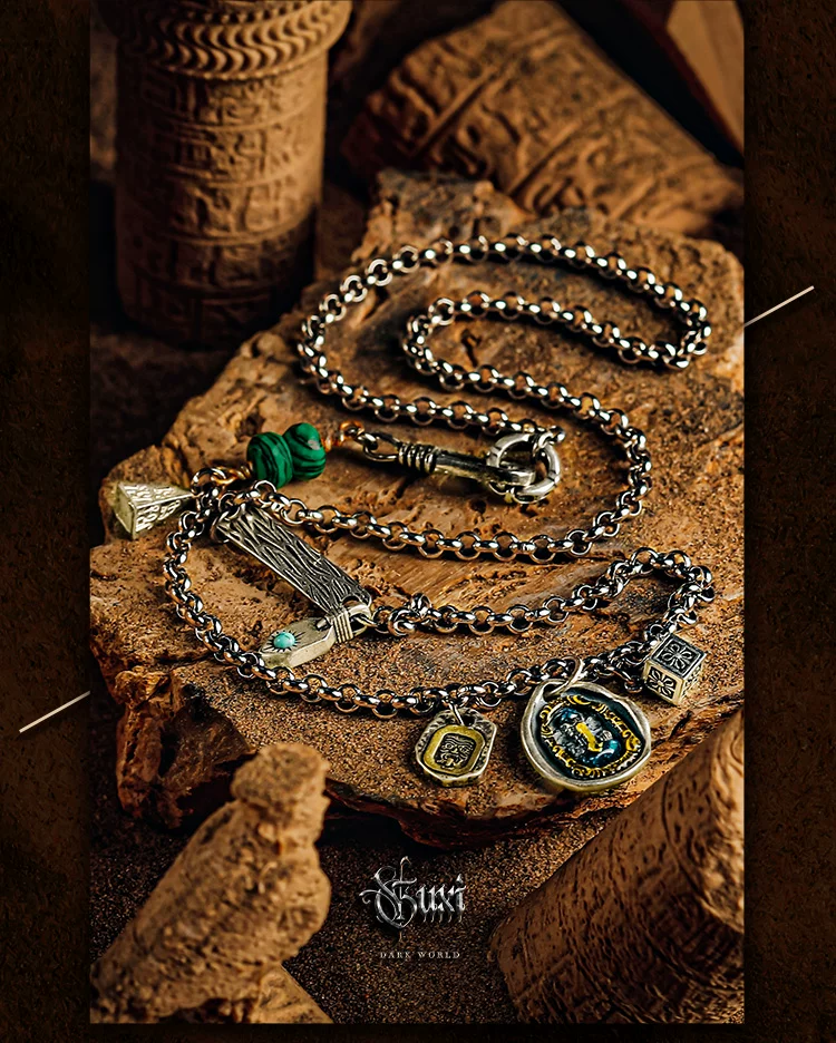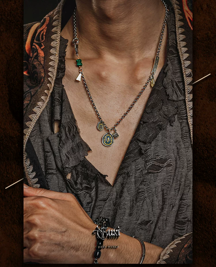 GUXI【询古】复古925银扎基拉姆项链男象神吊坠小众孔雀石毛衣链